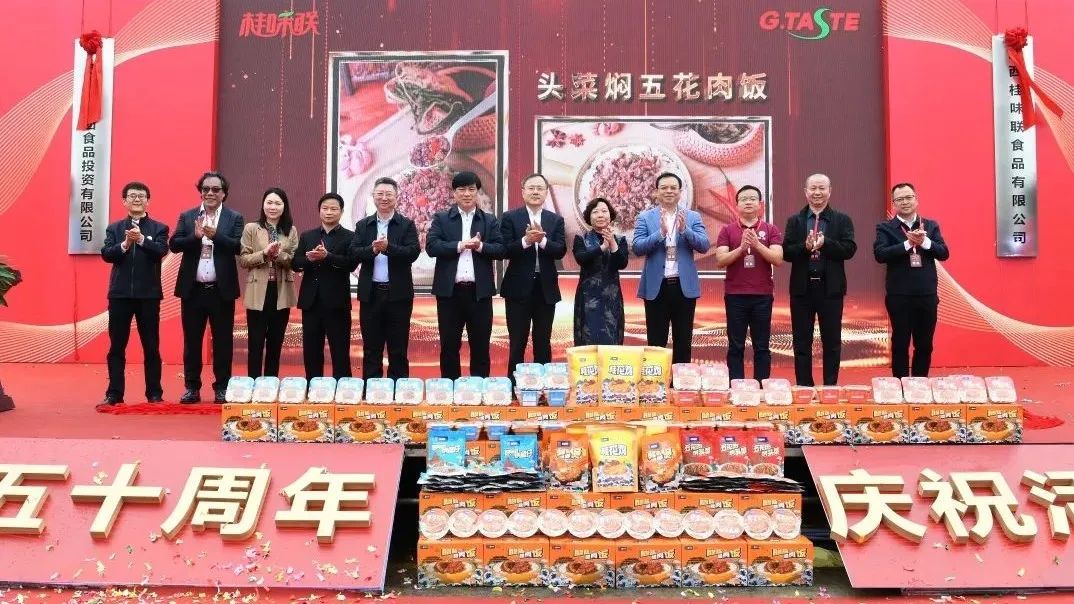 今天,在五十周年之際,肉聯(lián)廠公司迎來又一個歷史性時刻,肉聯(lián)廠公司正式更名為廣西柳工集團食品投資有限公司,肉聯(lián)廠全資子公司柳州天之業(yè)實業(yè)發(fā)展有限公司更名為廣西桂味聯(lián)食品有限公司,同時發(fā)布全新品牌“桂味聯(lián)”,以及“桂味聯(lián)”品牌系列預(yù)制菜酸筍黃豆燜魚仔、五花肉燜頭菜、黃豆魚仔飯、頭菜五花飯和桂花雞等五款新品,以全新形象奮進百年征程。