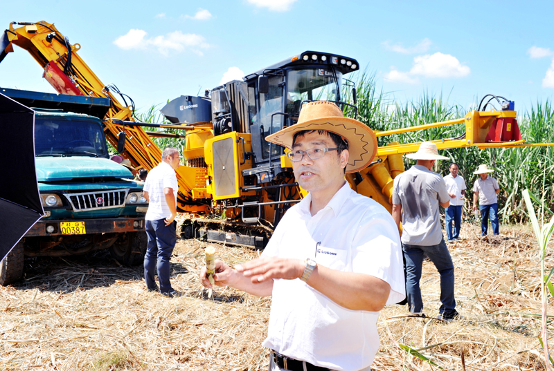9月27日,距離甘蔗收獲期還有一個多月,來賓市廖平農(nóng)場的甘蔗田里卻忙開了,由來賓市農(nóng)業(yè)機械化管理局和柳工農(nóng)機公司共同舉辦的甘蔗生產(chǎn)全程機械化現(xiàn)場演示會正在熱鬧的進行著。太陽被人聲鼎沸的場面吸引,過來湊熱鬧,展示會場面熱度、甘蔗田地表溫度節(jié)節(jié)攀升。集團公司副總裁黃祥全(如下圖),自治區(qū)、柳州市、來賓市、行業(yè)等相關(guān)部門領(lǐng)導(dǎo),各大糖業(yè)集團、農(nóng)業(yè)公司、合作社的代表,以及許多甘蔗種植大戶等近500名嘉賓到現(xiàn)場,在炙熱的陽光下,瞇縫著眼、呲著牙、伸長脖子,往甘蔗田里張望。