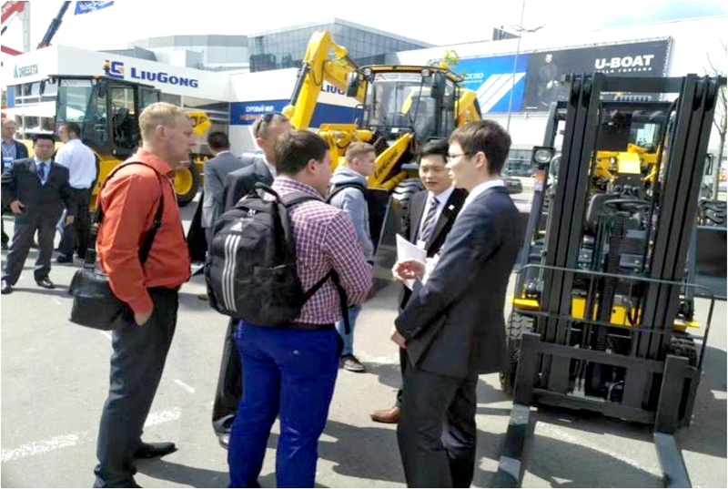 柳工俄羅斯經(jīng)銷商在展會(huì)中,展出了公司全新H系列裝載機(jī)及俄語(yǔ)區(qū)銷售的主流工程機(jī)械產(chǎn)品。包括CLG835H和CLG856H型號(hào)的2臺(tái)裝載機(jī),1臺(tái)CLG920E挖掘機(jī),1臺(tái)CLG4215平地機(jī),1臺(tái)CLG614H壓路機(jī),2臺(tái)叉車以及1臺(tái)TD-15M銳斯塔推土機(jī)。